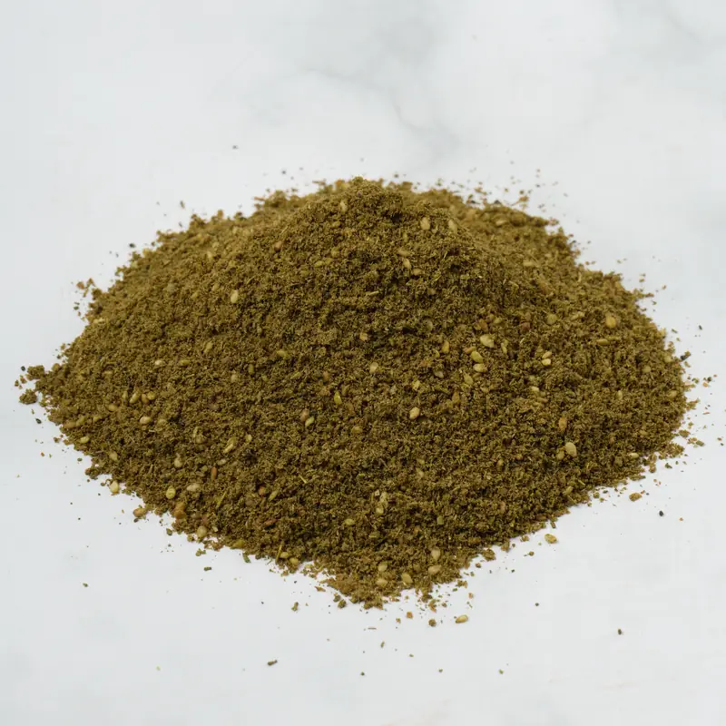 El zaatar en Colombia es una mezcla de especias tradicional del Medio Oriente. Generalmente combina tomillo, sumak, ajonjolí tostado y sal, creando un perfil herbal, ligeramente ácido y tostado.